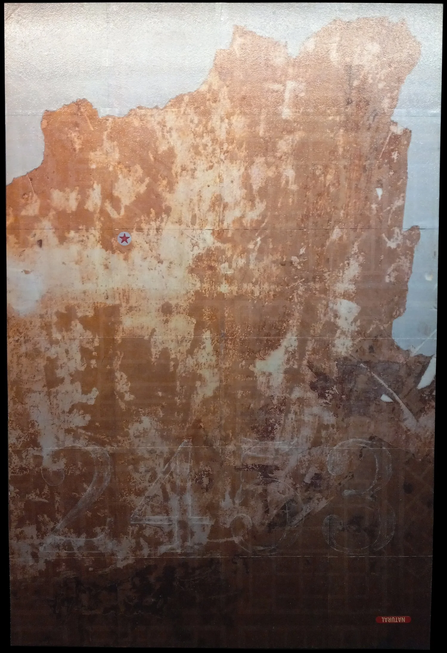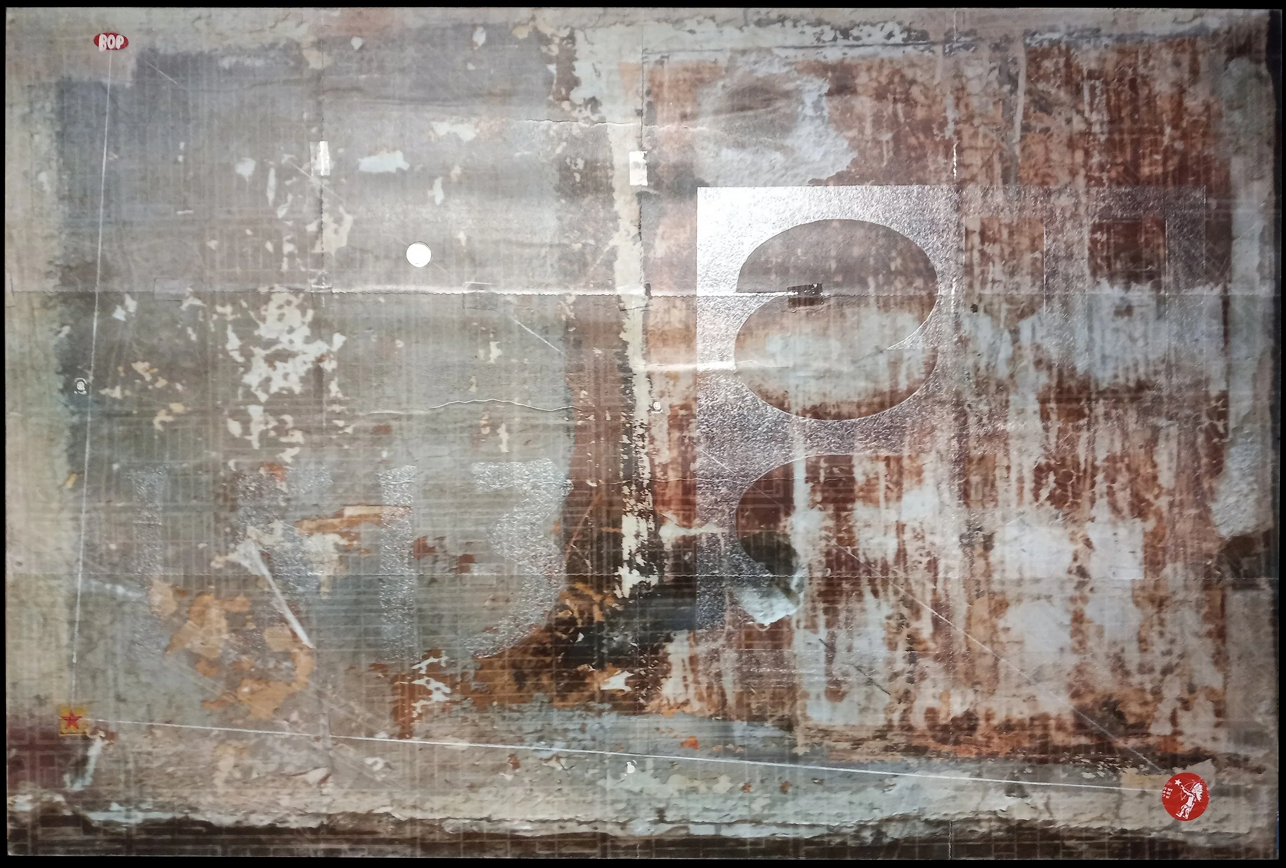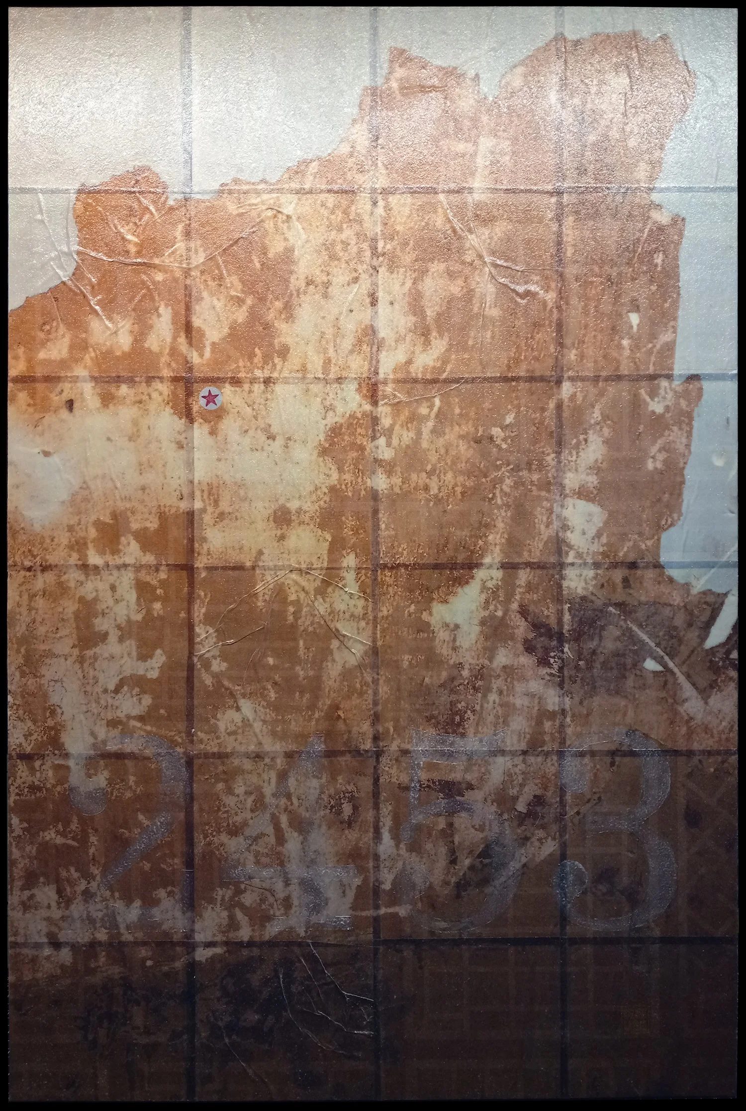 The image is of decayed paint and plaster from a wall in process of being refinished. Superimposed faintly over is a street map of Logan Square, stamped with a star of the location. Hidden in the clear glaze is 2453, the address, only seen at angles. I strive for engaging images that have deeper meaning found only when closely examined.