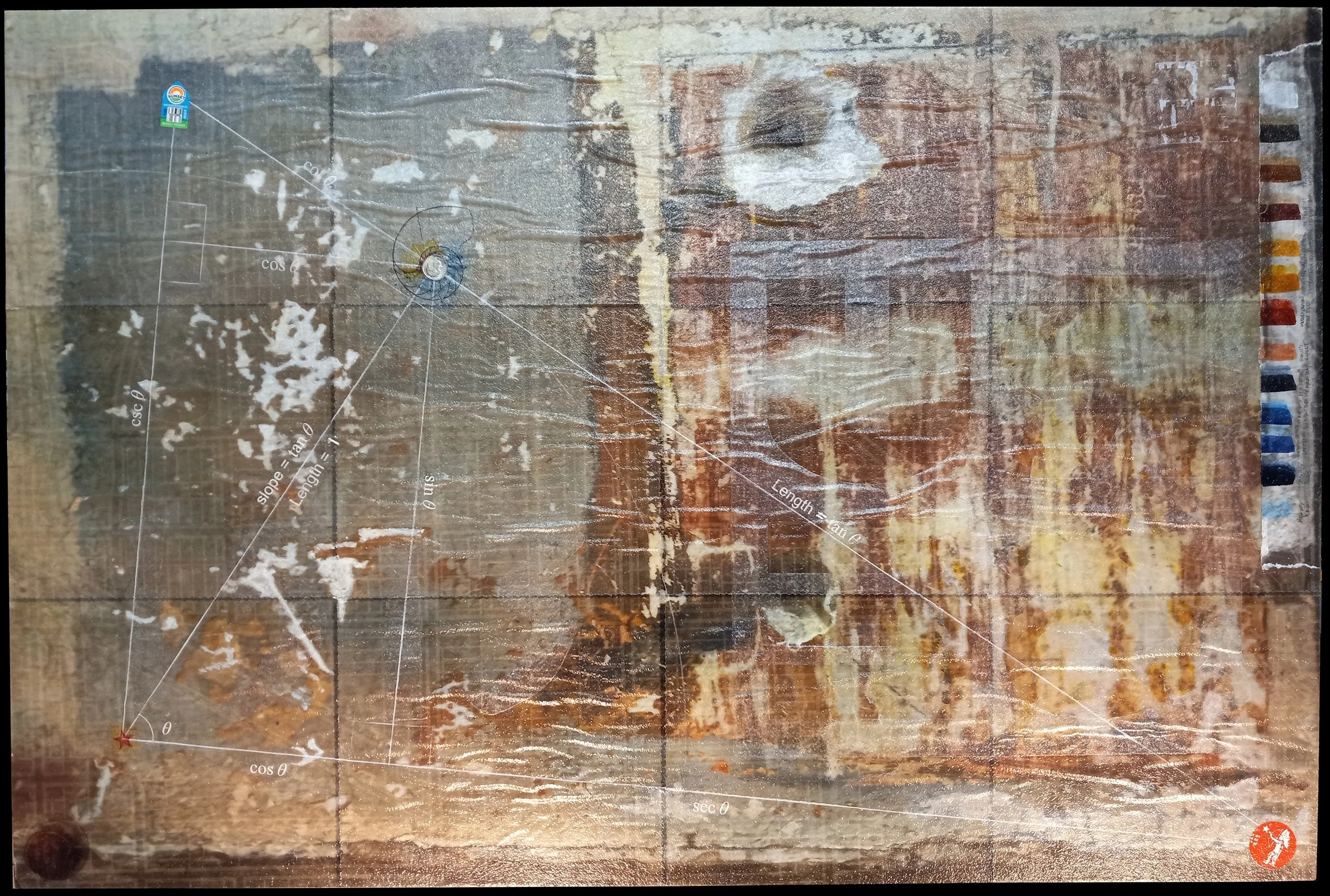 The number 1513 appears in one of the layers of glaze along with the word USER on #1 and RUSE on #2, both spelled backwards. USER and RUSE are styled to reference my work RE USE. It’s mirrored as a reflection of my interaction with Tony and the use of other’s work in my own. These glazed images are not easily photographed and must be looked for at an angle when viewed in person. An actual dime is collaged into the panel at the location of 1513 N Western on the overlaid map. It also appears at a point in a graphic of trigonometric functions and their reciprocals graphic. I want to believe that there is a formula for things and solution can be found if the right variables are in place. There are a few other collage elements that nod to Tony’s work indirectly as well as referencing my own. RIP Tony