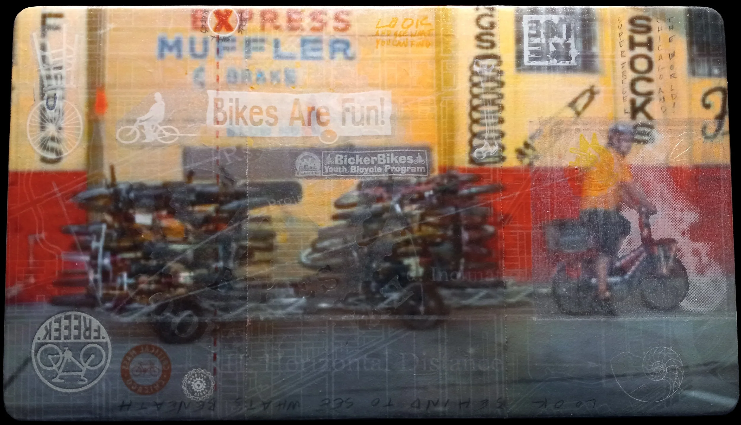 From 927 S Western Ave (A Trajectory of BikeFreeek), Digital Prints with Mixed Media and Collage on Steel Panel, 15”x26”, 2025 (Original photo by Lauren Salmi)