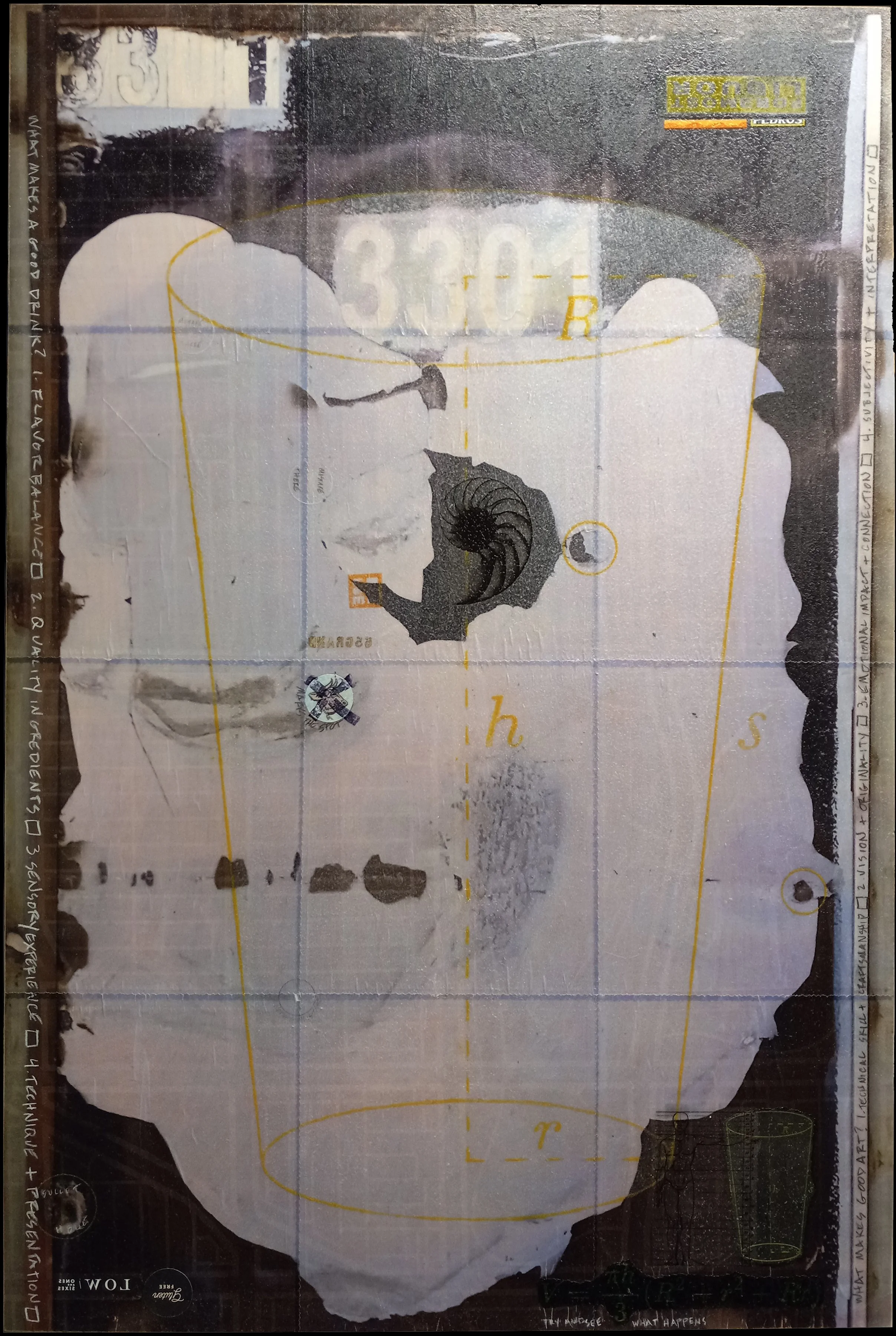 The base image in From 3301 W North Ave #1 & #2 is of the back door of Foremost Liquors located at that address. A map of the area is subtly overlaid and the location is marked with a collaged image of a bull’s head on #1 taken from the label of a bottle of vodka. The same bull’s head label marks the location on #2 but with an X marked over it. There is a diagram that looks like a pint glass that has the formula to find the volume of a conical cylinder. Other markers are placed on the map including the location of 65 GRAND gallery and my home. Two lists run up and down the sides of the piece that number ingredients for What Makes Good Art? and What Makes A Good Drink?. There are several other drawing and collage elements that reference art, environment, emotion and inebriants. Building upon an image of the back door of a liquor store, I explored the idea of how intoxicants calculate into a formula for Art.